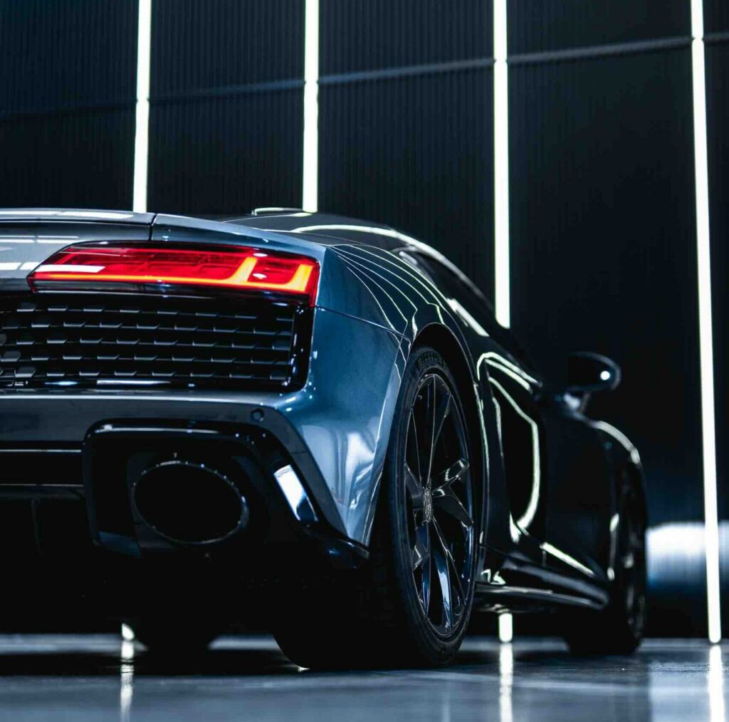 The striking design elements of the Audi R8 Coupé V10 performance include the far front passenger compartment, strongly emphasized wheel arches and a sporty diffuser.
