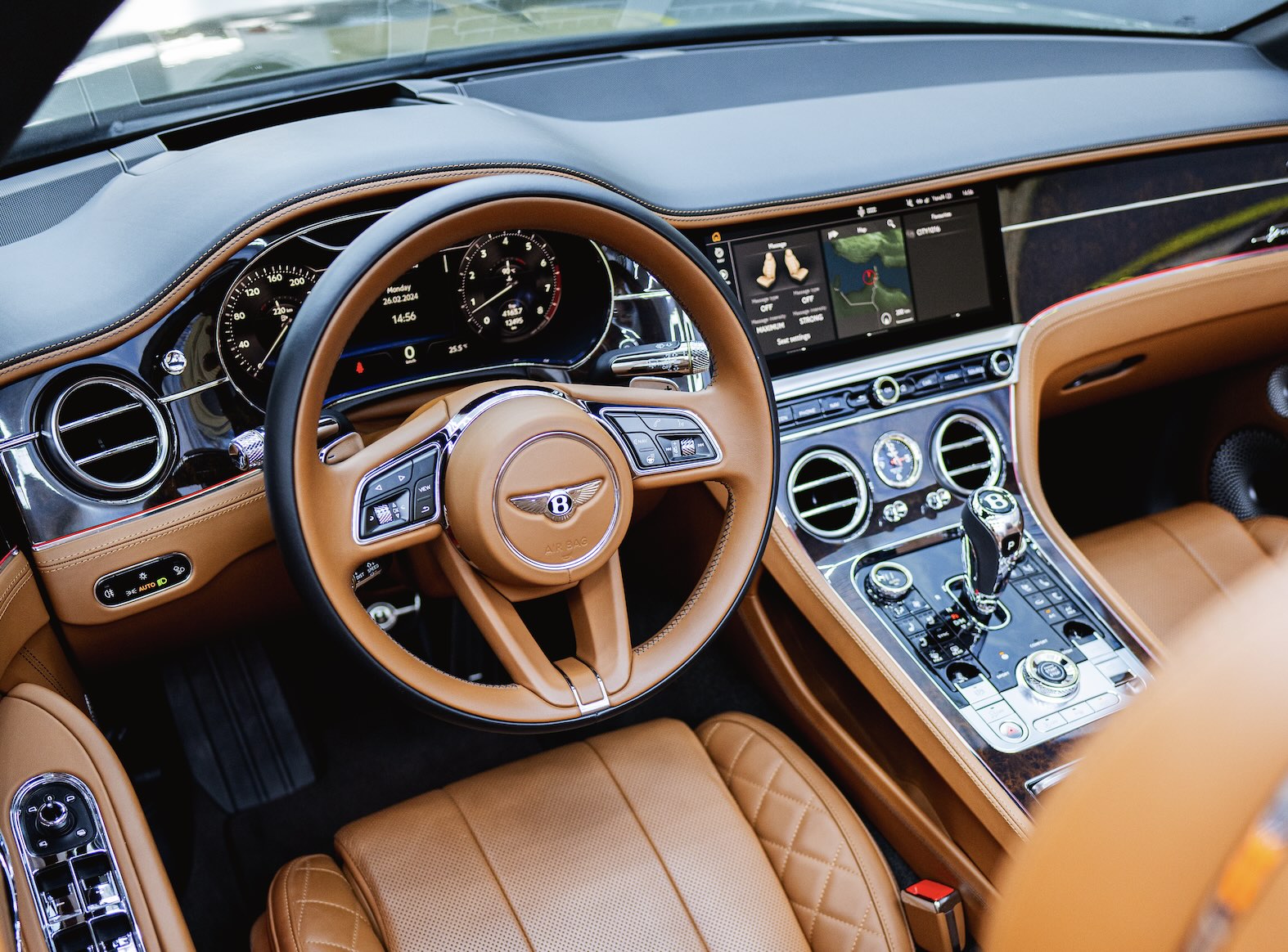 Интерьер кабриолета оснащен ультрасовременной цифровой приборной панелью, ориентированной на водителя, и фирменным вращающимся дисплеем Bentley Rotating Display.