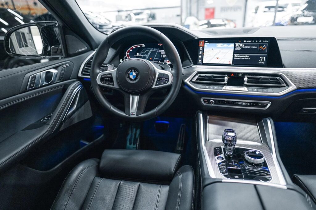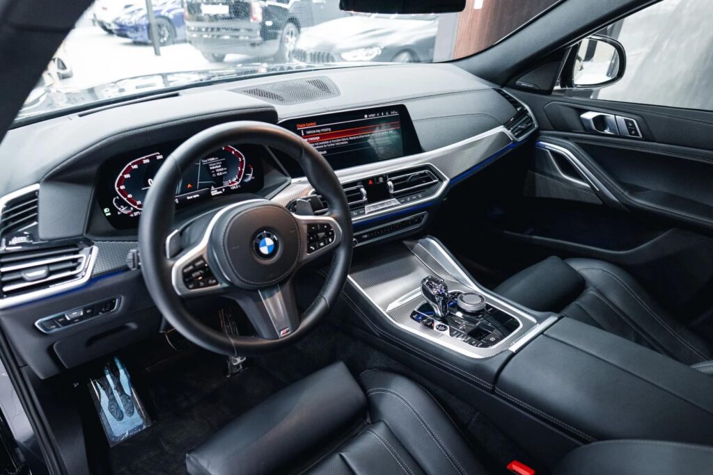 Прогрессивный дизайн — еще одно преимущество модели: черные акценты, карбоновые элементы и логотип X6 M на спинках сидений и рычаге КПП подчеркивают эксклюзивность этого SUV.