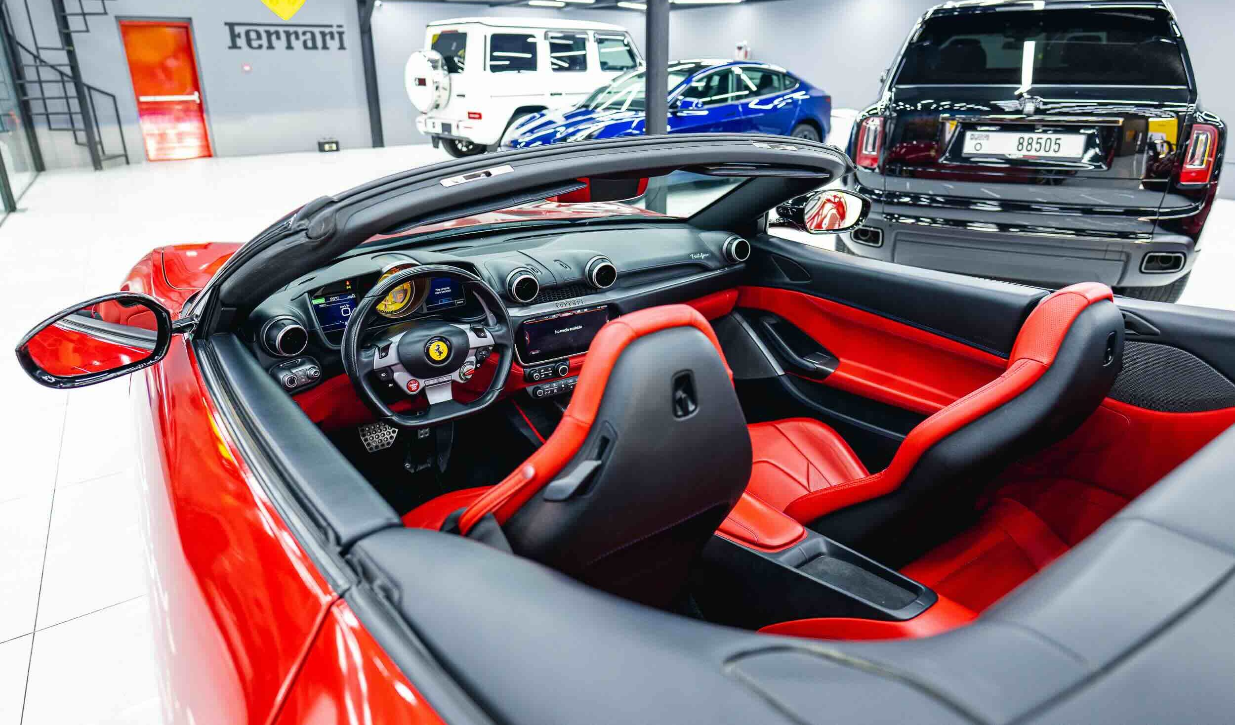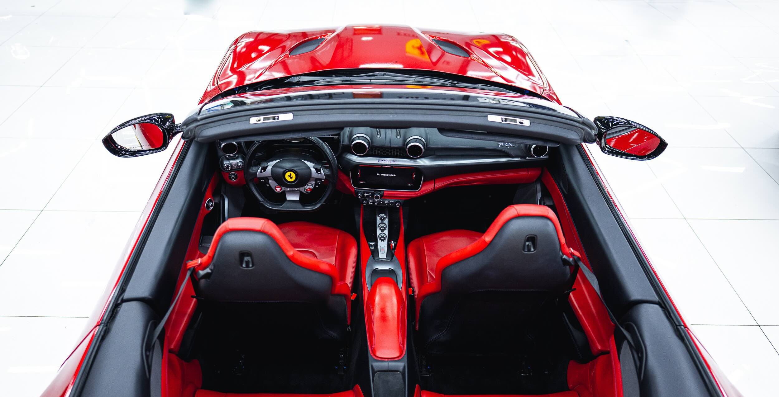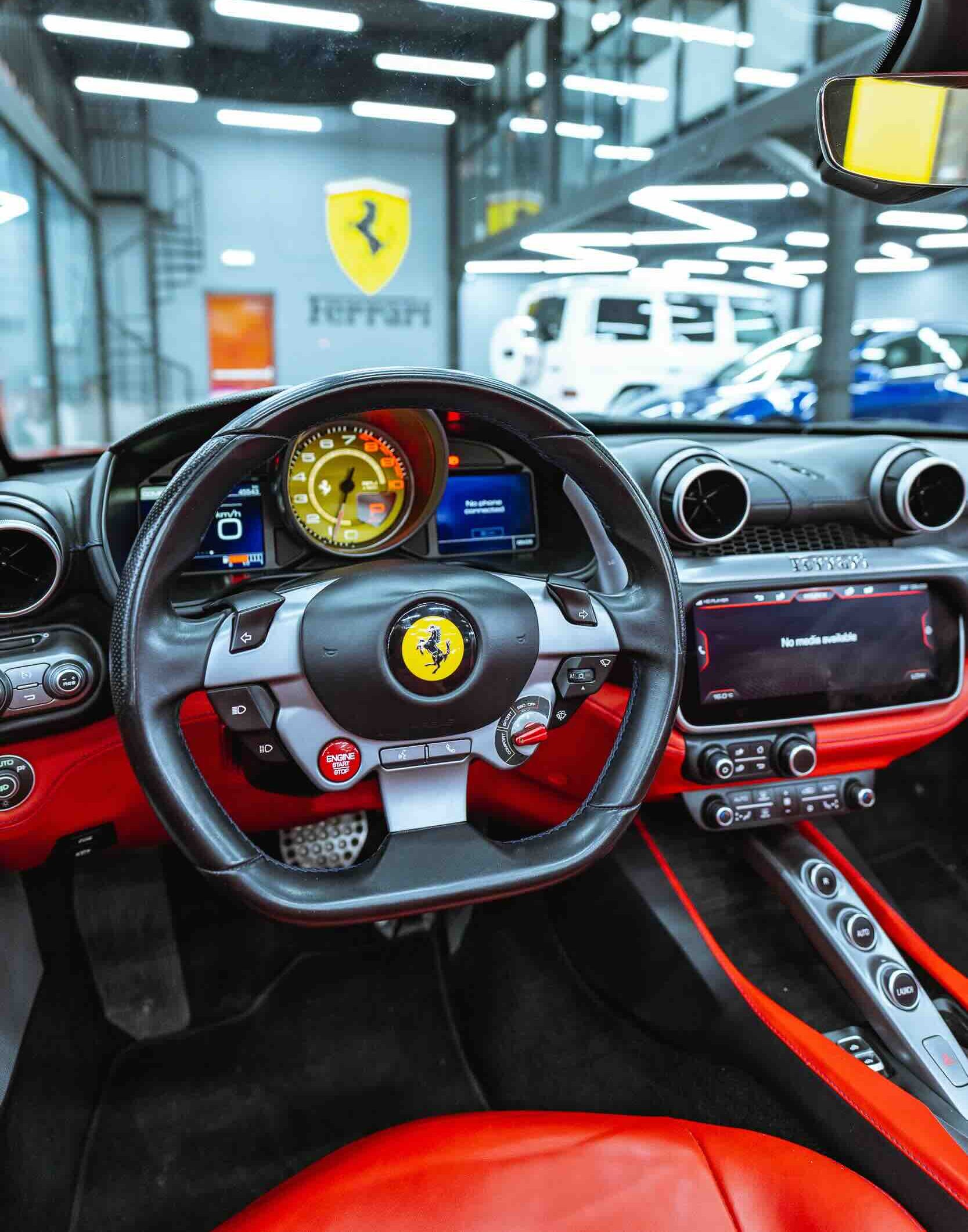 Интерьер Ferrari Portofino выглядит современно, привлекательно и благородно. Спортивный руль с усеченным ободом, эффектная приборная панель с аналоговыми шкалами сверху и двумя цветными дисплеями по бокам создают яркий облик.